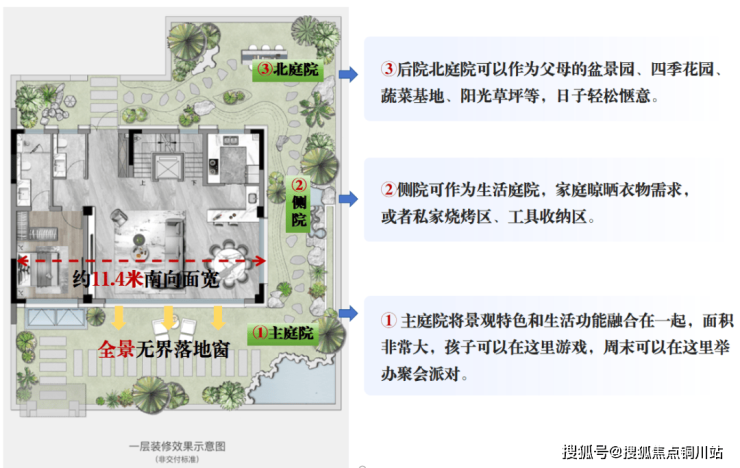 南/北向花园:作为家庭社交主场,可打造会客茶区、儿童乐园、阳光草坪。