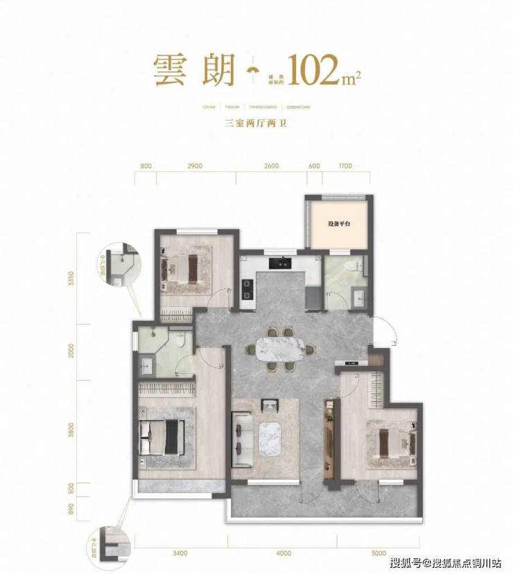 洋房102m²三室户型,最大得房率可到约90%,玄关处有独立的收纳空间,客卫连接的设备平台可以改造成家政间,南向阳台横跨客厅和次卧,主卧飘窗视野开阔,端户位置更升级为转角飘窗,尽享景观最大化体验。