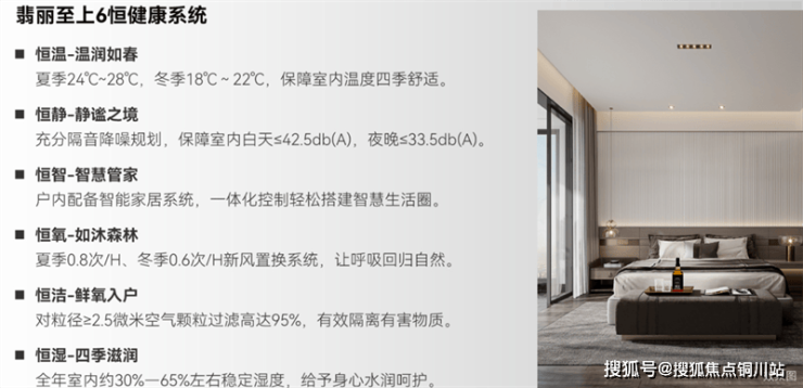 在“恒温、恒静、恒氧、恒洁、恒湿、恒智”的量化下,从温度、湿度、空气、声音等多个方面关注人们的健康问题,感知真正的智慧健康科技带给居住的幸福体验。