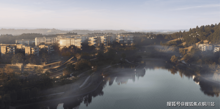 项目围绕着鸽子沟水库向心排布,带着重庆地形特有的高低起伏,犹如城市中天然隔世的“都市桃花源”,因循地势造景,利用高差形成覆土式建筑,消解建筑体量尺度。