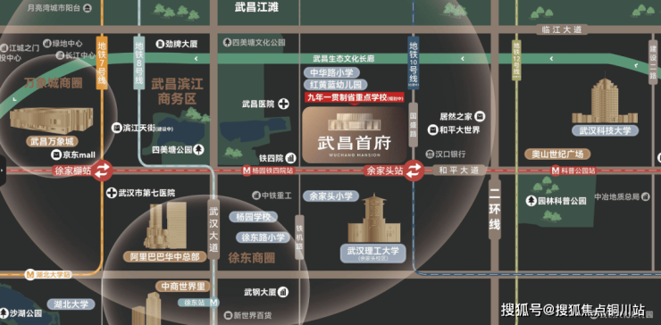 商业配套:武昌首府周边商业氛围浓厚,铁机路上成熟的社区底商能够满足居民日常的基本生活需求。项目自带特色商街,为居民提供更多样化的消费选择。此外,青山方向的武商城市奥莱、奥山世纪广场,武昌方向的徐东商圈、中商世界里、群星城等大型商业综合体均在项目 3 公里范围内。同时,武昌滨江商务区核心片的武昌万象城、京东 MALL 已开业,龙湖滨江天街也已基本建成,繁华商业触手可及。