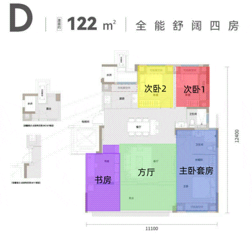 高得房率必然带来室内空间的扩充,因而原本至少需要建面约143平以上户型才能实现的四房两卫功能性,如今在云囍公馆建面约122平的产品上做到了。