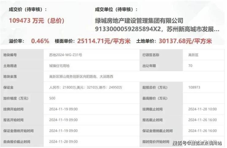 澜庭壹号院,即苏地2024-WG-Z31号地块,位于高新区狮山商务创新区向阳路南、大运路西,2024年绿城&苏高新以总价约10.9亿元竞得,成交楼面价为25115元/㎡,溢价率0.46%。