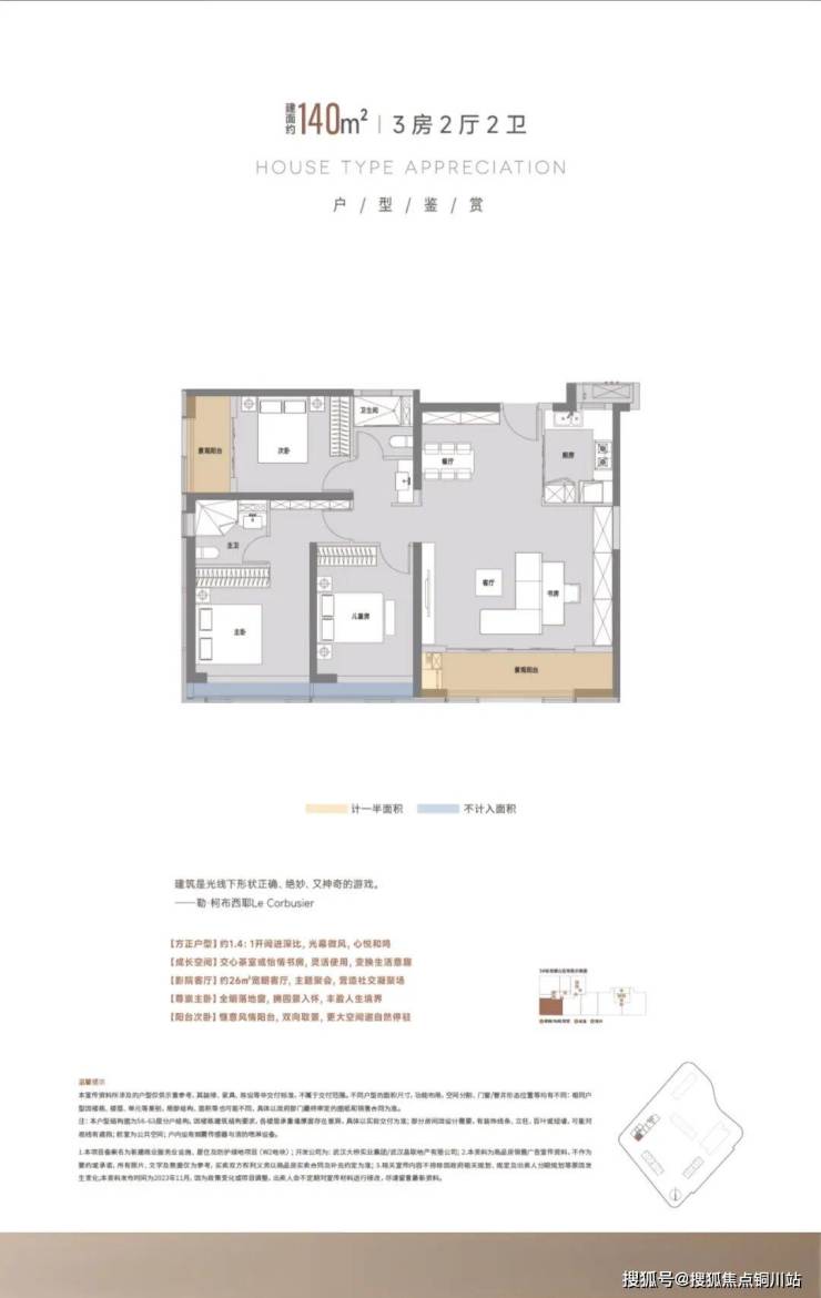 140㎡户型则以3+1房、2厅、2卫,做出了同类产品中180㎡的空间阔绰感。整个户型四面方正、南北通透,北向次卧带景观阳台,主卧和儿童房均带大飘窗,有效使用空间非常大。