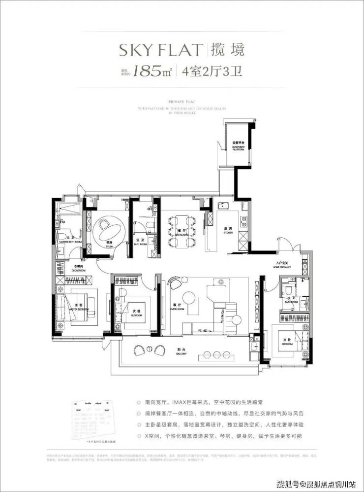①空间感优越。在建面约185㎡的空间内,没有单一的追求房间多,以4房2厅3卫的布局,实现功能改善和尺度改善的兼顾。
