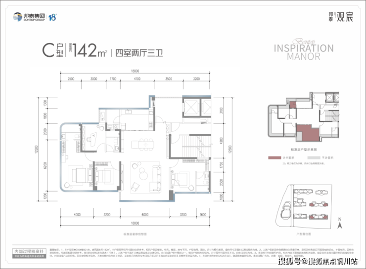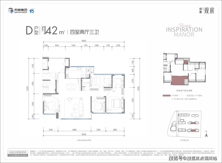 建面约142㎡4房2厅3卫双套房的户型结构,约142㎡的建面做到客厅开间约6.8米(中间户,边户客厅开间约6米),4开间朝南,整体南向尺度达到约16.6米(中间户,边户南向开间约18米)。