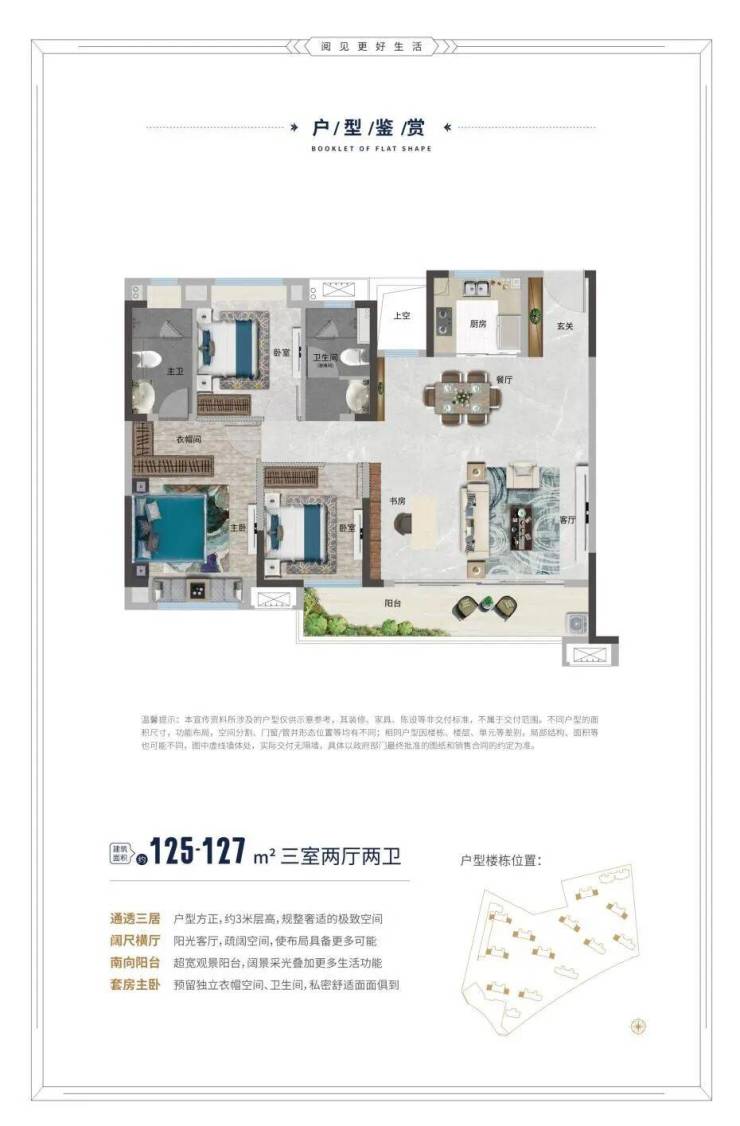 同样是三房两厅两卫,建面约125㎡舒适度更高,约6m宽的大横厅一览无余,甚至生活阳台破尺度高达约7.9m,尺度感不输建面约160-180㎡的豪宅大平层。