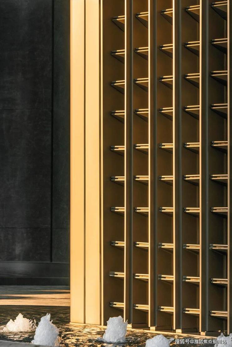 三阶叠水层层下落,涌泉树池相映成趣,一侧的叠水面还以纯手工铺设了1088片鱼鳞石,只为呈现更生动的视觉质感。