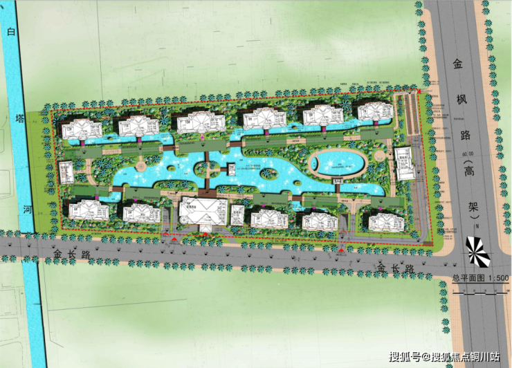 从平面图上,可以清晰地看到水系景观贯穿整个社区,每栋楼都能欣赏到水景。
