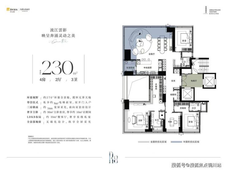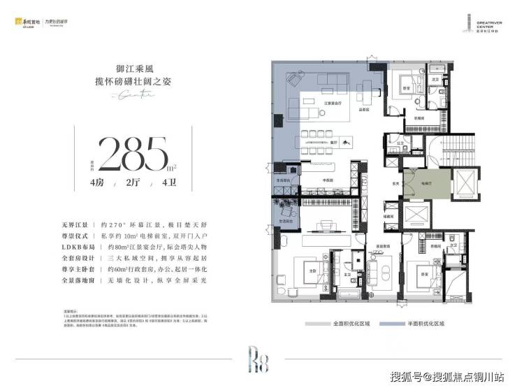 产品定位:项目主打建面约 180-450 平方米的大平层产品,且无小户型产品,确保了业主圈层的纯粹性。其中,建面约 450 平方米的户型为武汉滨江市场罕见的 “超级大平层”,采用 “一梯一户” 设计,拥有独立入户玄关、270° 环幕观景阳台及超大尺度客厅,满足了顶级客户对 “极致居住体验” 的需求,填补了武汉高端大平层市场的空白。