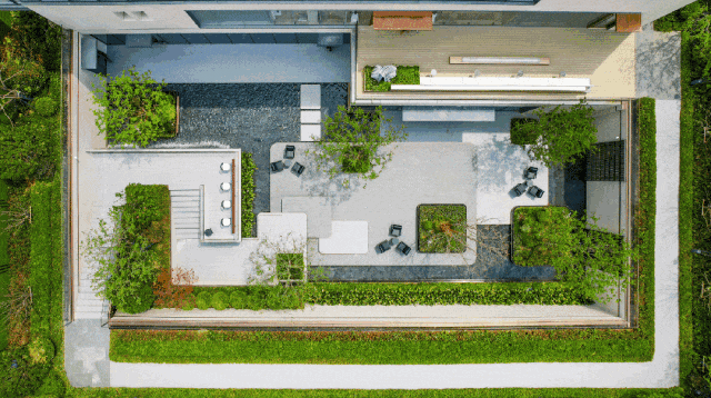 会客厅环绕中央下沉式庭院,硕大的落地窗前,是三花四季的一览无余。不用诗和远方,也能享受高端酒店的度假感。