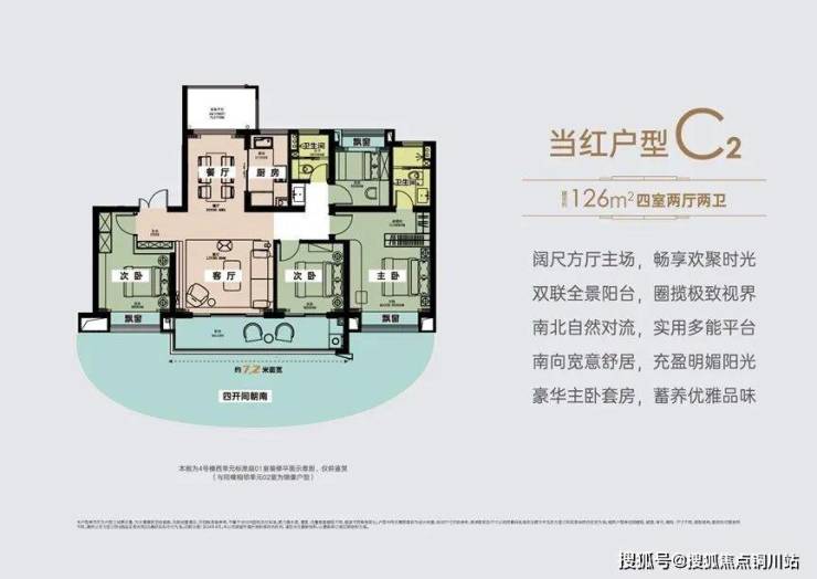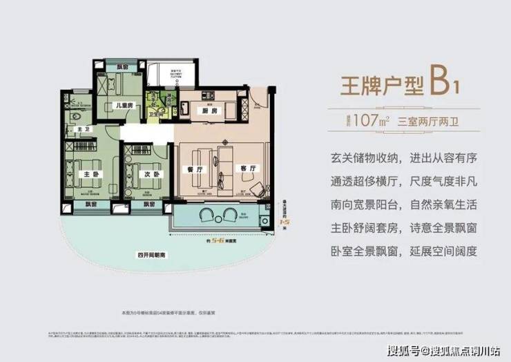 大三房设计,三开间朝南,南北通透;约6.4*1.5米的南向双开间阳台,更利于打造多种生活场景;主卧私享一侧,儿童房、客卫另立一边,大大提高各自私密性。