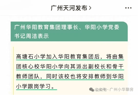 天河政府官微已在去年官宣该校加入华阳教育集团,并由原华阳小学向其派出副校长和骨干教师团队进驻,相当于拥有纯净“华阳系”血统。