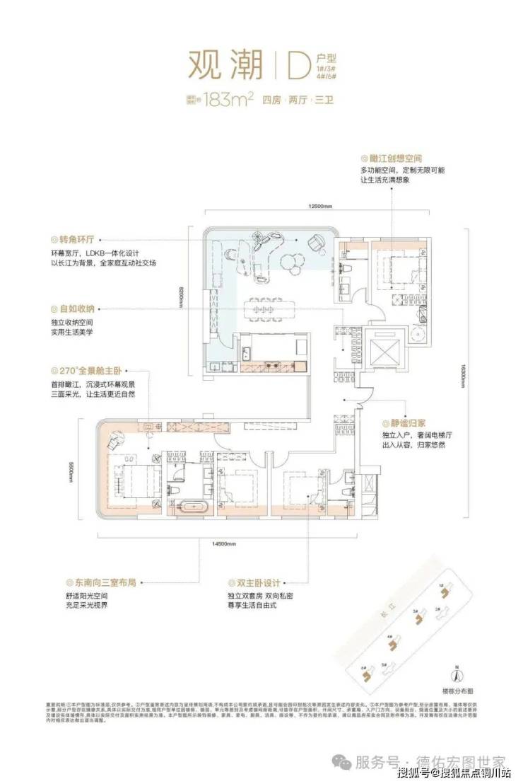 该户型三面采光,三开间朝南,带独立电梯前室,270度观江,设计非常有想象力。
