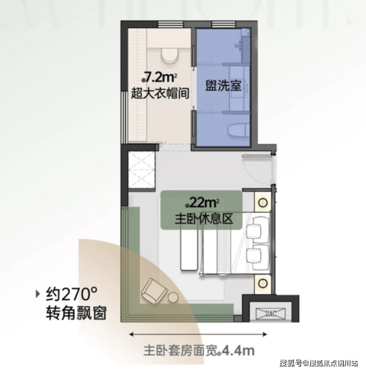 几乎没有一个小房间,约34.7㎡的主卧+约14.1㎡的次卧双套,空间贼大!