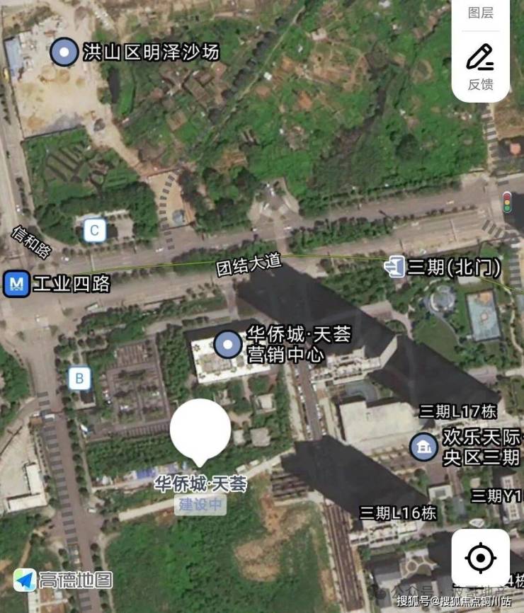 项目四至:北侧为团结大道;南侧天兴洲绿岛小区;西侧为信和路、工业四路地铁口及项目二期待建地块;东侧为欢乐天际中央区、杨春湖路。