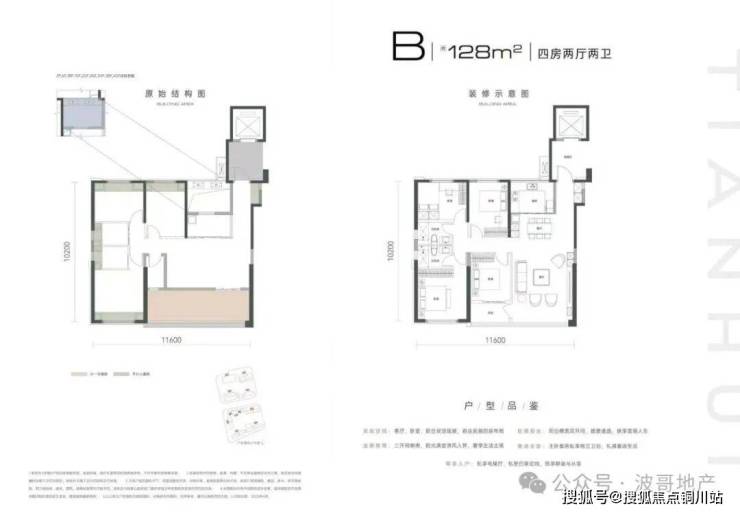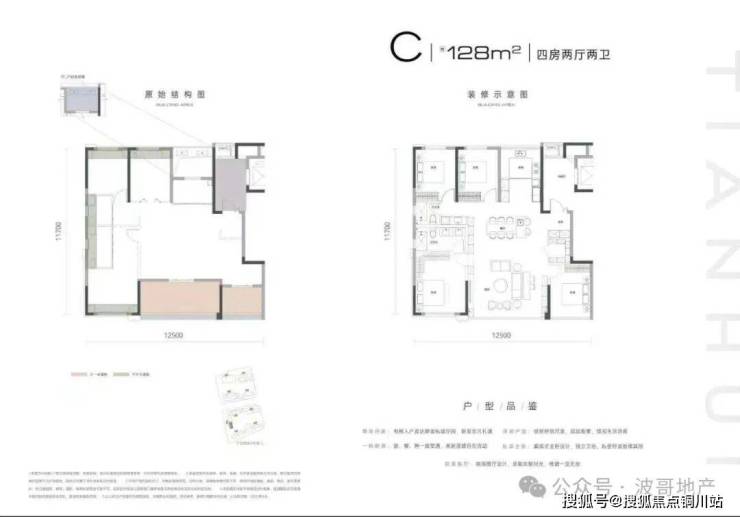 C128㎡四室两厅两卫:此户型分布在4号楼小高层设计总层高10层,一梯两户布局,三开间朝南,相对B户型,同面积段空间利用率更高,但楼栋夹在3号楼和5号楼之间朝向偏西南;入户转角玄观设计,整体户型开间(宽)约12.5米、进深约11.7米。