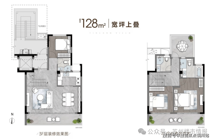 上叠128㎡,每层都带有双联阳台,同样是横厅设计,还带有私享空中庭院。