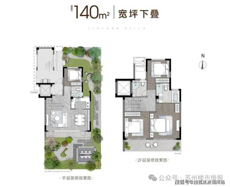 其中,140㎡下叠庭院面积约40㎡,一层拥有大横厅,二楼为生活区,主卧大套房设计。