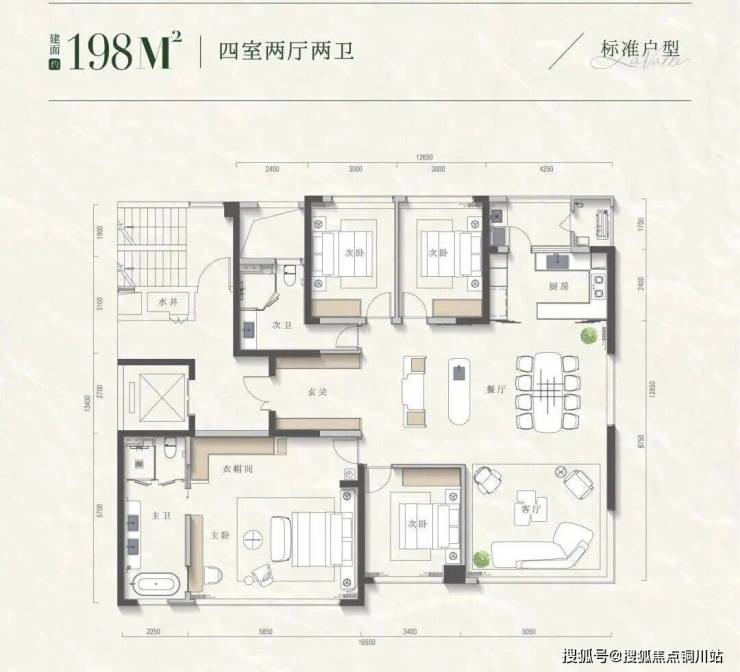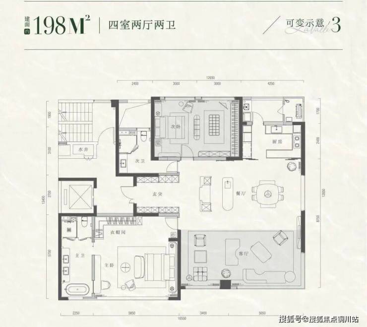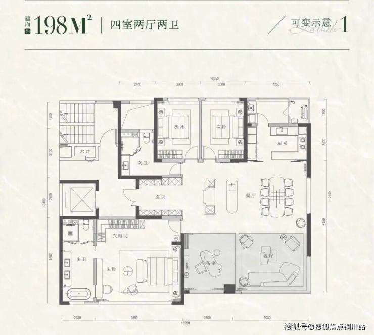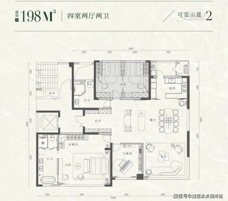 云逸主推建面约146㎡、173㎡、198㎡三种可变户型。以建面198㎡为例,云逸提供了4种截然不同的生活剧本: