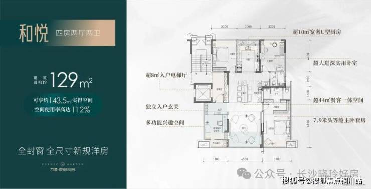 【四房两厅两卫】建筑面积约:129㎡;实得面积约:143.5㎡;实际得房率112%;,相当于旧规169㎡!(旧规户型按85%得房率计算,仅供参考)