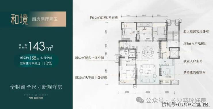 【四房两厅两卫】建筑面积约:143㎡;实得面积约:158㎡;实际得房率110%;,相当于旧规186㎡!(旧规户型按85%得房率计算,仅供参考)