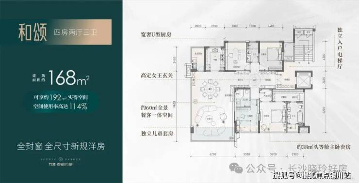 【四房两厅三卫】建筑面积约:168㎡;实得面积约:192㎡;实际得房率114%;相当于旧规226㎡!(旧规户型按85%得房率计算,仅供参考)