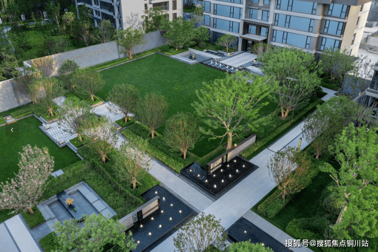四水归堂水聚天心,环抱一方静池,建筑表皮在水的波光中交相辉映,造型独特的朴树孤植于其中,与山石流水共同绘制一幅静谧,闲适惬意。