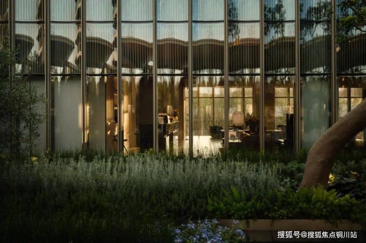 提取建筑形式语言-精制45°斜角设计融入空间中;极致简约的体块关系设计,通过纯粹的几何形态、有序的排列、虚实对比,与前方灰绿色调的植物融合,形成简洁、现代且富有艺术感的视觉效果;