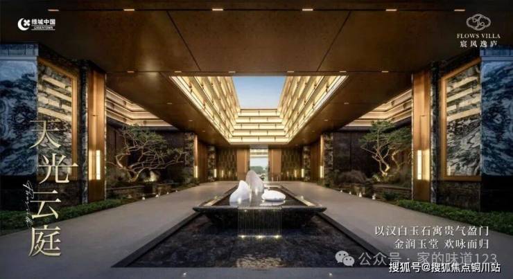主入口“浮玉映宸”高达9.5米,取意“九五登峰”,建筑形制上参考官帽,设计十分考究。两侧以“翠谷幽兰”奢石点睛,地面精选“砂岩流水”水纹通铺,“四水归堂”的归家礼序,承载着对生活“步步登高”的美好期许。
