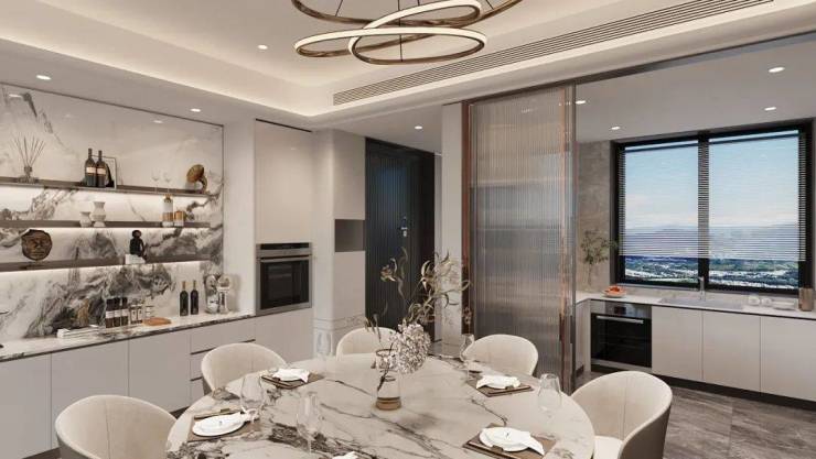约50㎡LDK一体化无界空间,是一个家的情感凝聚中心,盛放家庭成员的自在社交;中西双厨灵动格局,在洄游式的优雅动线中,开启一场品味盛宴。