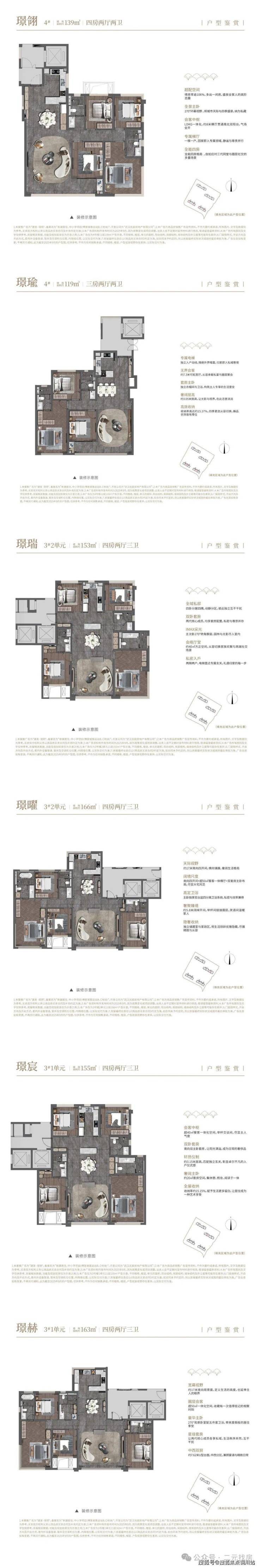 项目的户型有119、139、153、155、163、166㎡,所有户型的得房率均不低于100%。