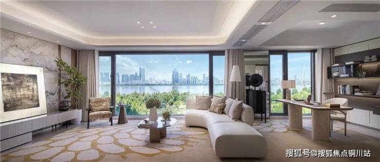 整个项目,每户住宅层高做到3.05米,每户沿江面均配置全景落地LOW-E玻璃幕墙,实现约7.4—9米的看江横厅、全景舱270度无界观江体验。