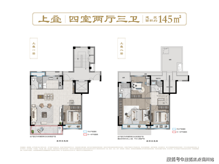 上叠建面约145平,3室2厅3卫设计:五层入户有独立玄关,方便解放双手,餐客厨一体化的设计,空间餐桌旁配有导台,方便中西厨分餐,方便一家人交流沟通,享受时光。五层还配有一个朝南卧室,六层则为休息区,卧室+书房+卫生间设计,享有舒适居住生活。