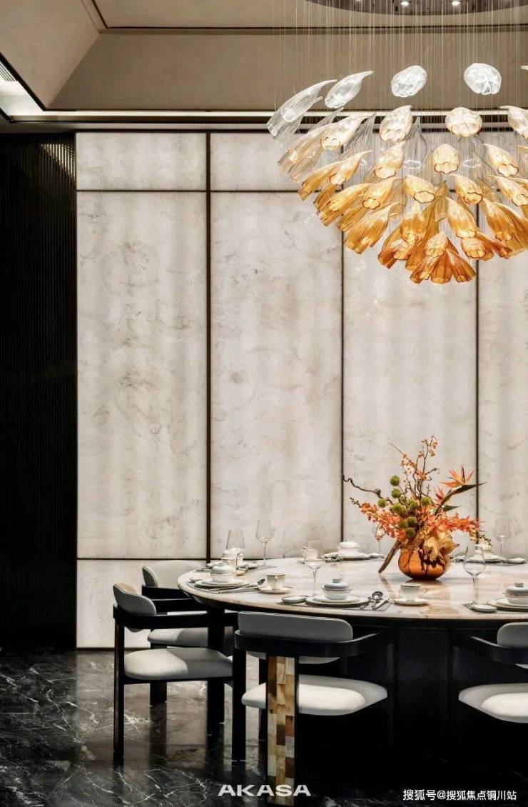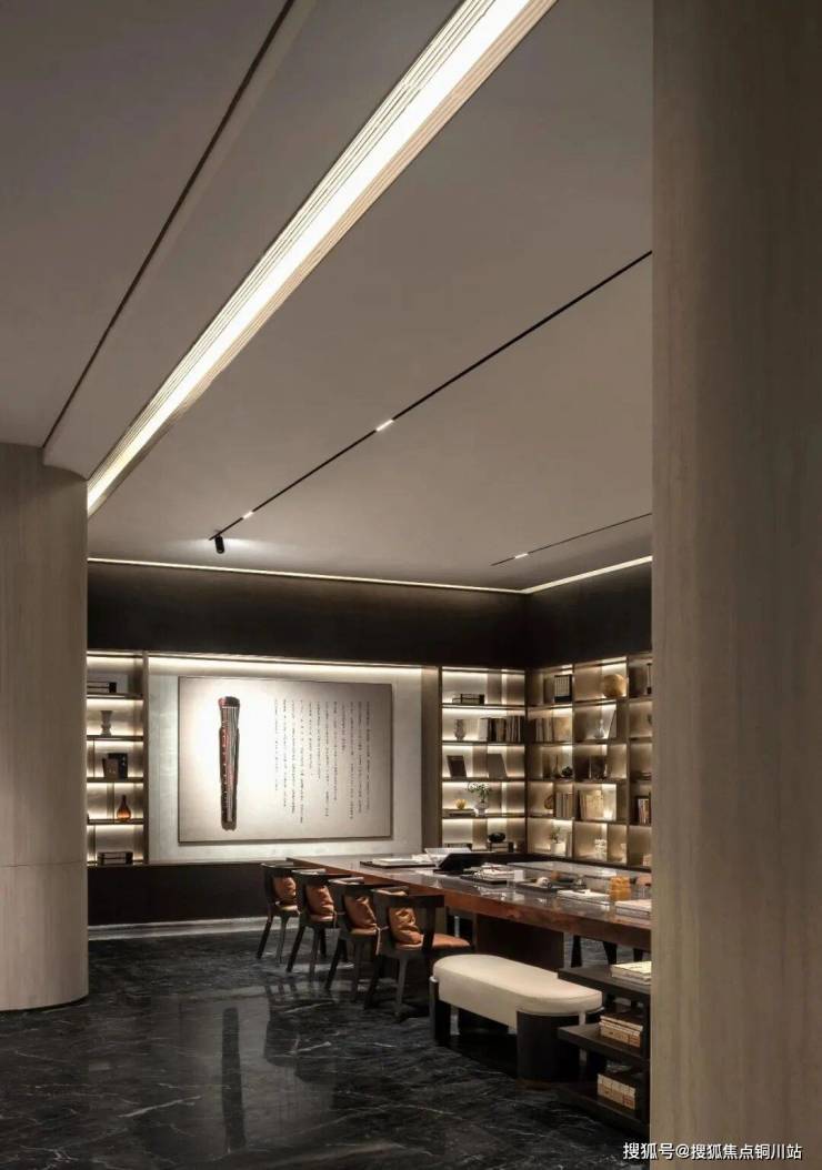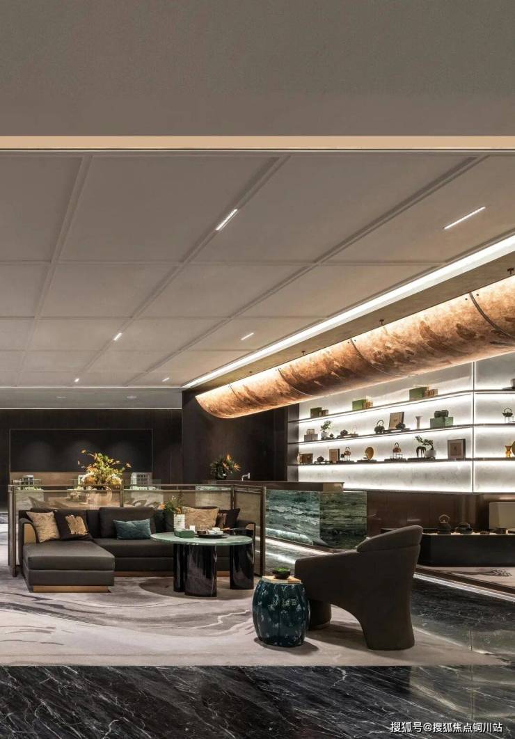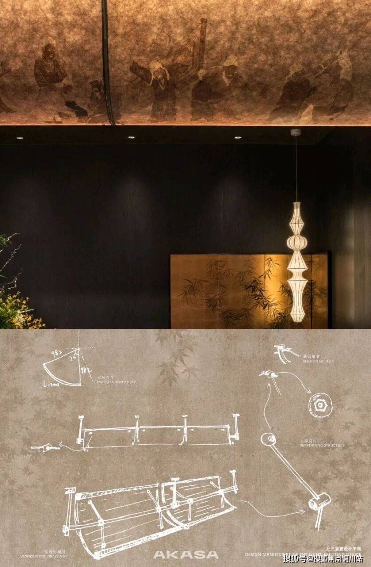 本次售楼会所设计以无锡的城市魅力和宋式美学为背景,充分体现了对传统文化的尊重与传承,最具代表性的是吧台顶部的发光装置。装置由弧形导光板、印花杜邦纸以及线性灯带组成,是整个会所的一大视觉亮点。