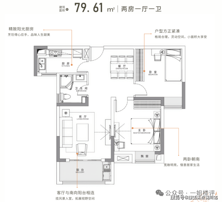 建面约79平 两房两厅一卫:这是新房市场极为罕见的小户型,中间户全朝南的结构,比连廊结构私密性更好。还有南向阳台、两个房间的飘窗可优化。