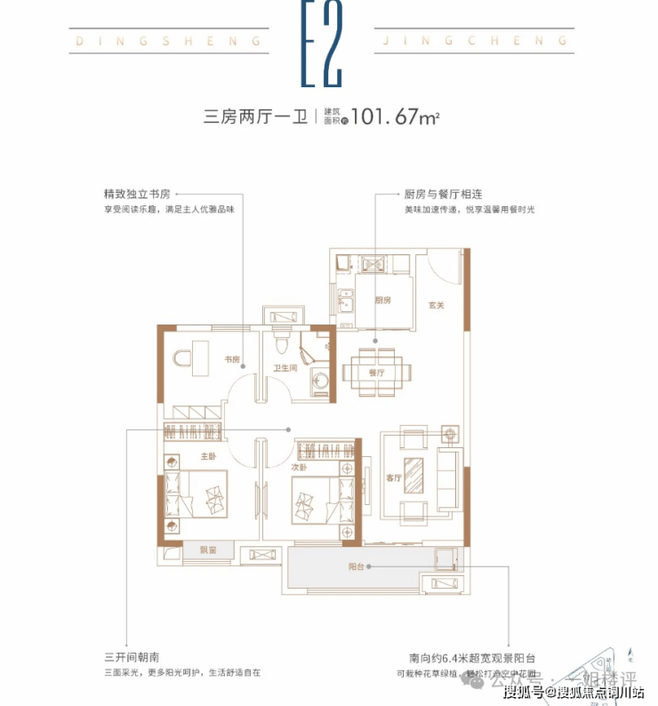 建面约101平 三房两厅一卫:这个户型是非常方正的三房,做到了三开间朝南,连廊结构可实现南北通透的效果。关键是这个户型动静分区做得很好。