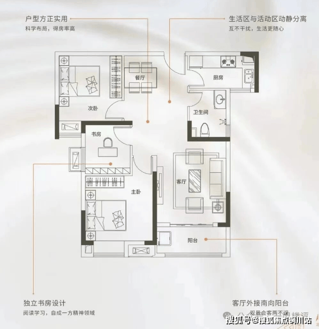 建面约95平 三房两厅一卫:这也是全朝南的小户型,但做了三房,功能性更强,且主卧与次卧之间隔了一个书房,做了空间隔离,私密性更强,书房也能改成儿童房等。