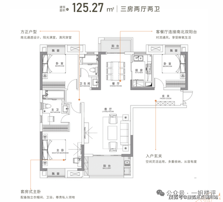 建面约125平 三房两厅两卫:这是一个通透性很强的边户,主卧与北向次卧实现通透,客餐厅南北双阳台,通透性更是极好;且三个房间完全分开布局,家庭成员都有相对独立的空间,是当下非常受欢迎的私密性产品。