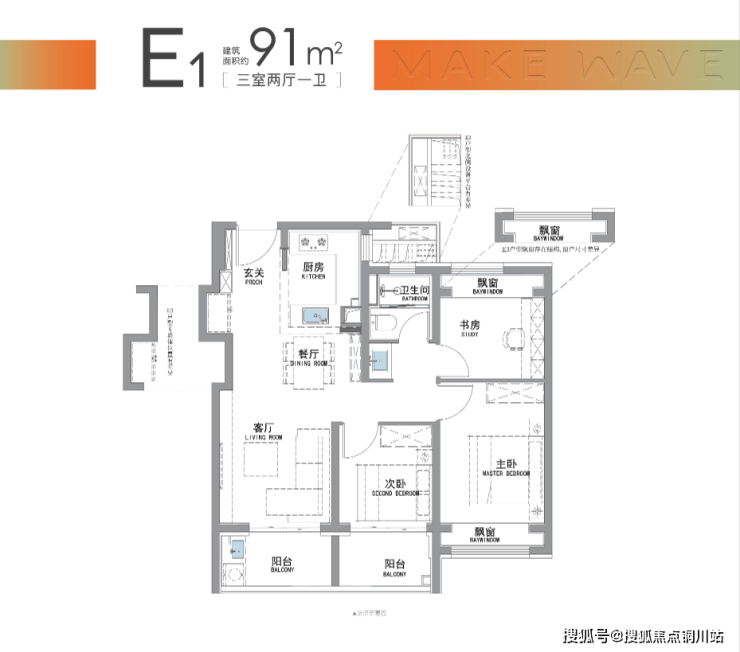 南向双阳台的设计让这个建面约91㎡的户型能与很多建面约100㎡以上的3房越级pk。