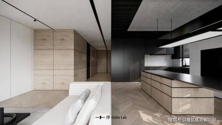 将原本的封闭式厨房改造为开放式厨房,巧妙地打破了空间的界限,极大提升了室内的通透性与宽敞感。橱柜选用黑色材质,与空间中原有的温润木色和纯净白色形成鲜明而和谐的对比,赋予了整个空间现代而时尚的视觉张力。