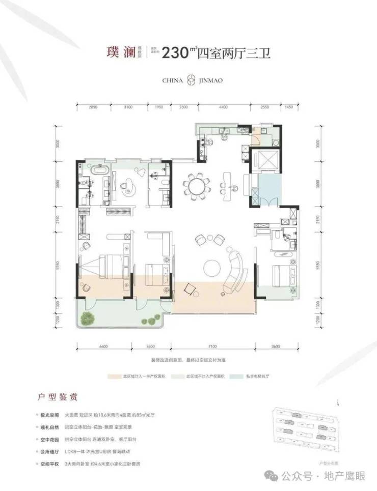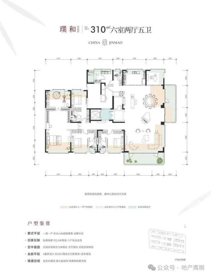 建筑面积约230㎡超宽境空中庭院,则诠释了更高阶的人生秩序。空中浮岛双跨露台,如同城市阳台连接主次卧空间,将盎然绿意引入私密领域。南向约18.6m的逸境面宽,确保一厅三卧四大主功能区皆能尽享丰沛光照与开阔视野。一梯一户的专属归家礼序,入户/主卧双门开阖,尽显气度。约4.6m开间的总统套房主卧空间,将私享露台、宽敞衣帽间及梳妆区一一容纳,演绎超越寻常的奢适尺度,是犒赏人生的至臻逸所。