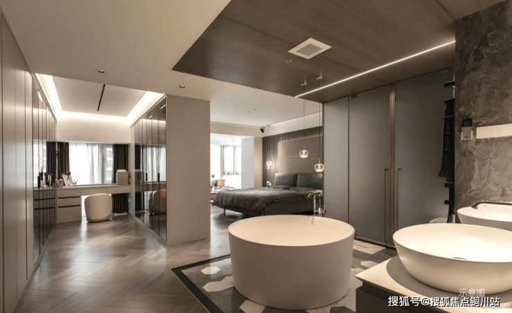 令人称道的是,相邻北向卧室,可以与主卧打通,打造为主卧的衣帽间、书房、钢琴房、茶室等,使主卧多了一个兴趣功能空间。如此整个套间设计洄游动线,大可实现同屋不同界,如伴侣在休息,另一人无论洗漱、化妆、更衣、练琴,都可互不惊扰,无比贴心。
