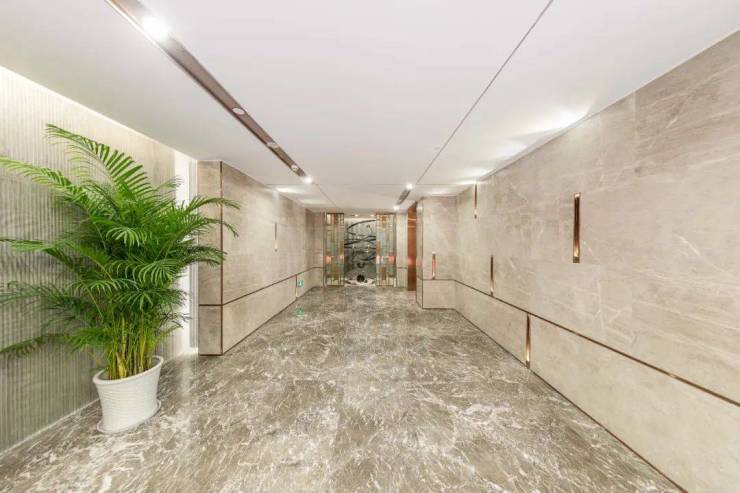 还有入户精装大堂,地面、墙面均采用大理石铺装,配合线性光源点缀,公区的质感同样拉满。