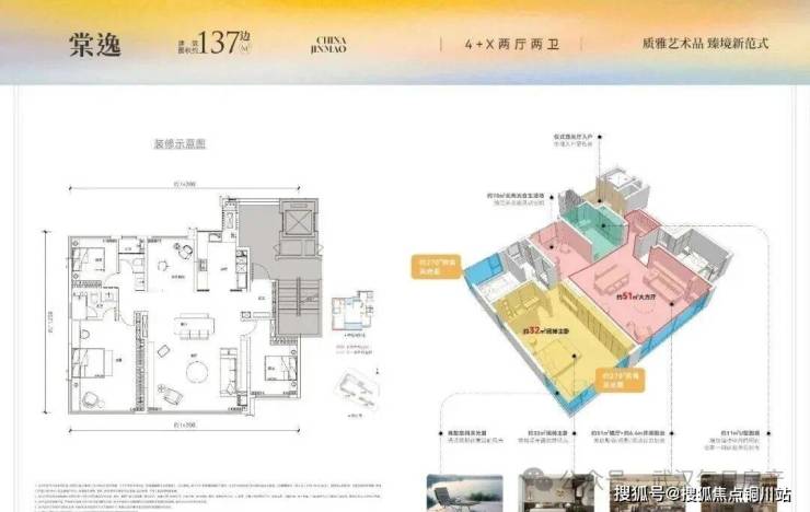 棠逸(建面约137㎡,4+X房2厅2卫):洋房边户;一梯两户,双开门电梯私密性好,可独享电梯前室;四叶草造型,浪费面积较少,三代同堂可互不打扰;约51㎡大方厅+约6.4米开阔阳台,家庭聚会、运动、观影可自如切换;南向主卧和北向次卧均带270°转角采光面,可俯赏四时风光。