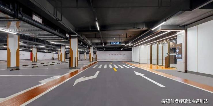 落到归家的另一重动线——地下车库,乍一看,不论是更适合年轻人的配色,还是地下墙面的工艺,都可以与宁波当下3w+楼盘的地下空间相媲美,尤其在地下门厅的入口处,以大面亮色面板饰面,搭配上金属质感的门框和格栅吊顶,让归家的尊崇感在这一刻油然而生。富有标识性的指引系统,一目了然的视觉观感。