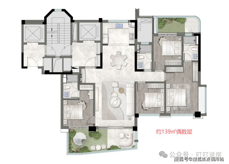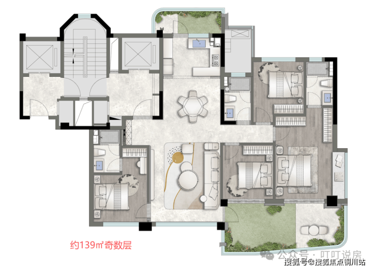 但值得注意的是,139㎡的偶数层是客厅带露台的,而174㎡是奇数层客厅带露台。