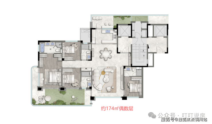 尤其是174㎡的偶数层主卧是转角露台,使用面积和视野是偶数层所不能比拟的。