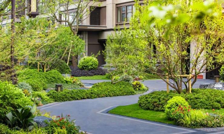 叠墅之间,兼夹错落的是绿浪泛波的对景设计,特色的铺装和景石结合曲线步道的林下空间,加之宅间平台小景的设计,让业主归家之路变得优雅从容。