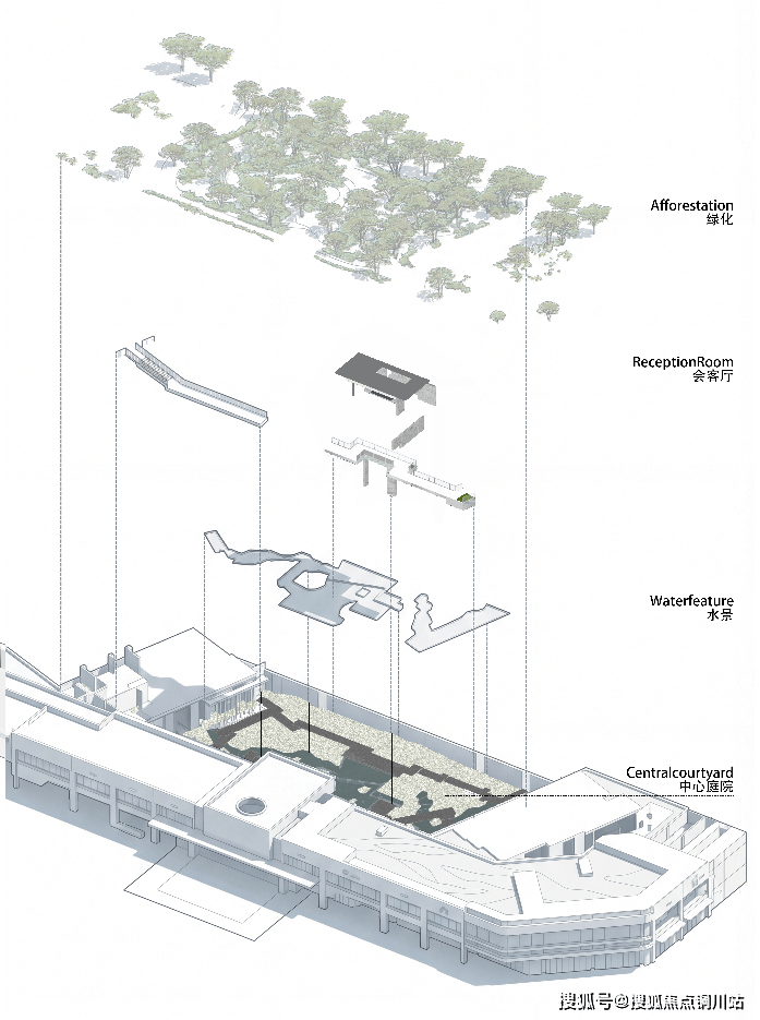 为打破竖向空间的静态,让空间回归一种师法自然的松弛状态。于廊桥设置4.5米落差的壮观飞瀑,宛若自然界的落水峡谷,潺潺水声掩去了环境的杂音,营造出沉浸式声景氛围。